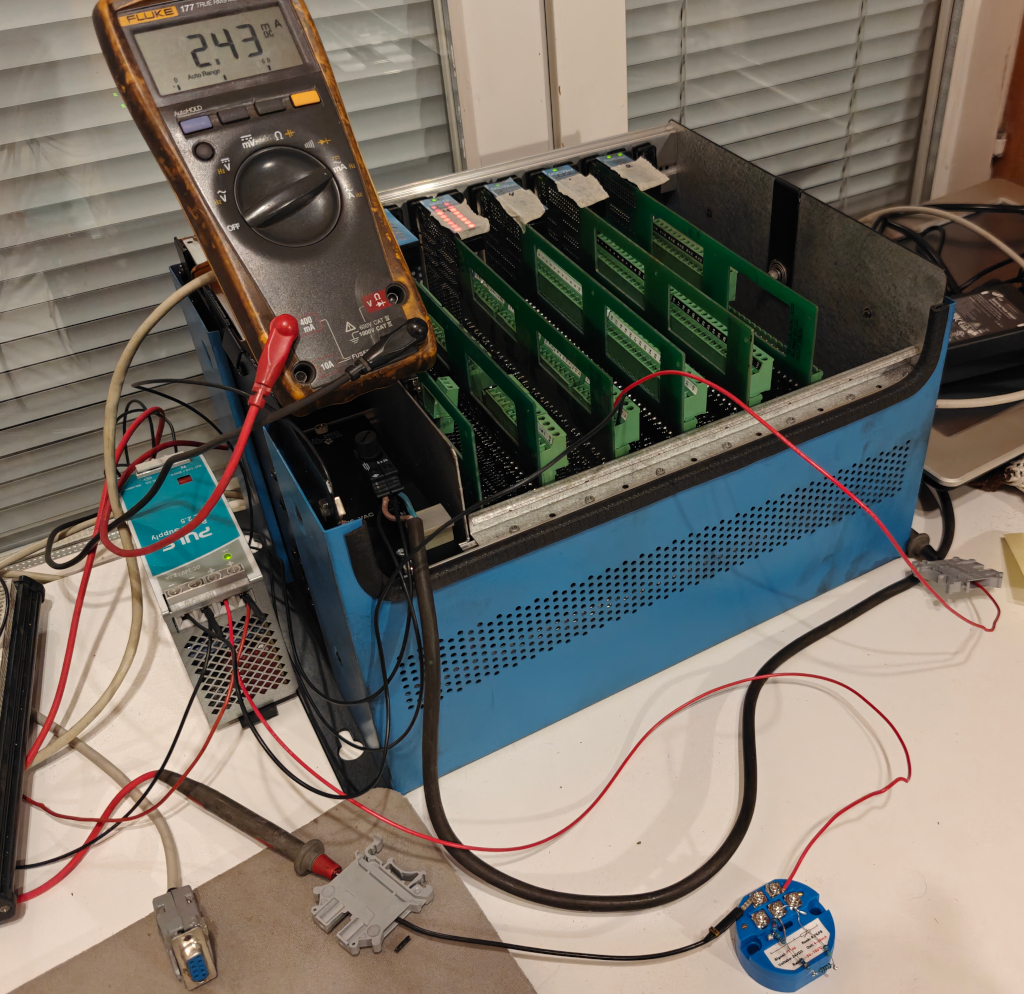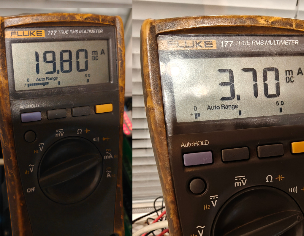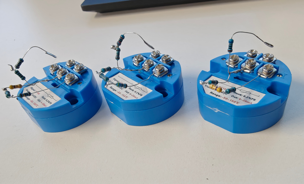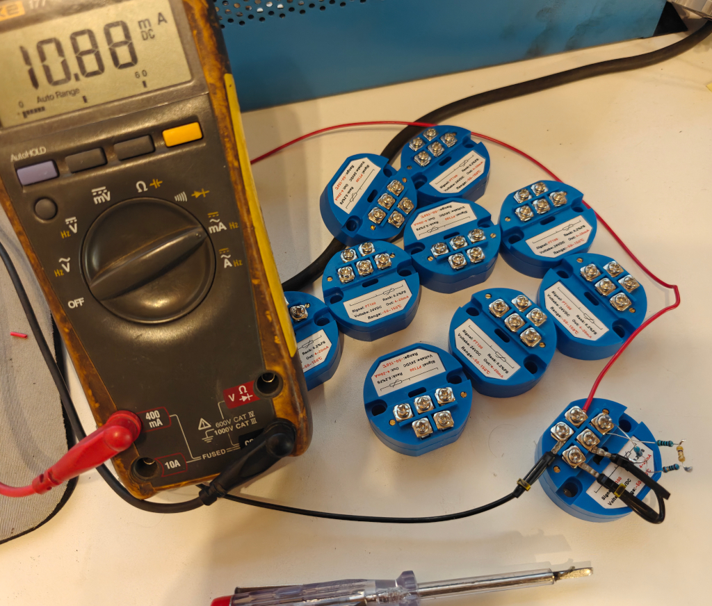 Huoneisiin tulevien lähettimien kohdalla tuli ongelmia. Span ei riitä(kalibrointi siis suoritetaan zero ja span ruuveilla, zero nollapiste(tai alempi kalibrointipiste haluttuun virtaviestiin) ja span vastaava ylempi piste). En mitenkään saa 18.6mA virtaa näillä vastuksilla. Kokeilemalla selvisi, että maksimi virta on 12.5mA vastuksillani. Piti laskea kaikki uudestaan, ja muuttaa lähettimen lämpötila-aluetta. Luulen, että löysin nyt sopivan alueen: -10..+86°C(tai aluksi -10..80 mutta kas yksi lähetin pääsi just ja just siihen. Ajattelin että pikkusen säätövaraa jäisi, jos alue ei kiristäisi joten +8 astetta). Vastukset pysyy samoina, alempi kalibrointipiste vastukset rinnan 97.3Ω vastaa −7,0∘C lämpötilaa, virtaviesti 4.5mA. Ylempi kalibrointipiste 113.7Ω vastaa 35.6∘C lämpötilaa, ja virtaviesti 11.6mA. Näin span ruuvi ei ole ihan ääriasennossa.