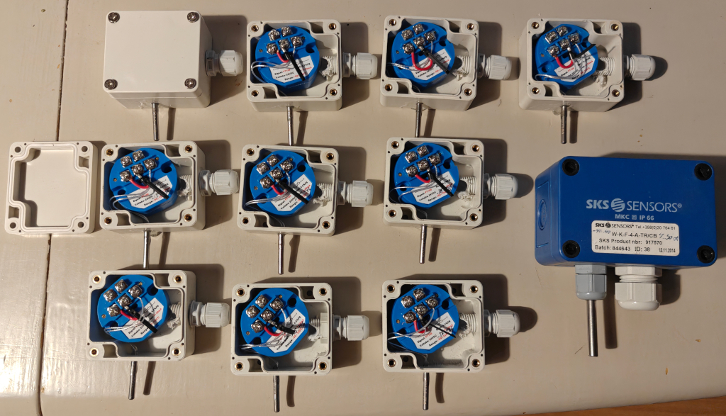 eBaysta tilasin samoja komponentteja mitä Hallillakin tuli käytettyä. Koteloita, PT100 antureita, milliampeerilähettimiä. Kustannukset näille: Kotelo vähän alle 2€/kpl, lähettimet 2,97€/kpl ja anturit 1,48€/kpl, toimituskuluineen ja veroineen. Mitä noita valmiina paketteina joitain vuosia sitten katselin, niin 70€ taisi olla edullisimmat paketit ja tuskin on hinnat ainakaan laskeneet...