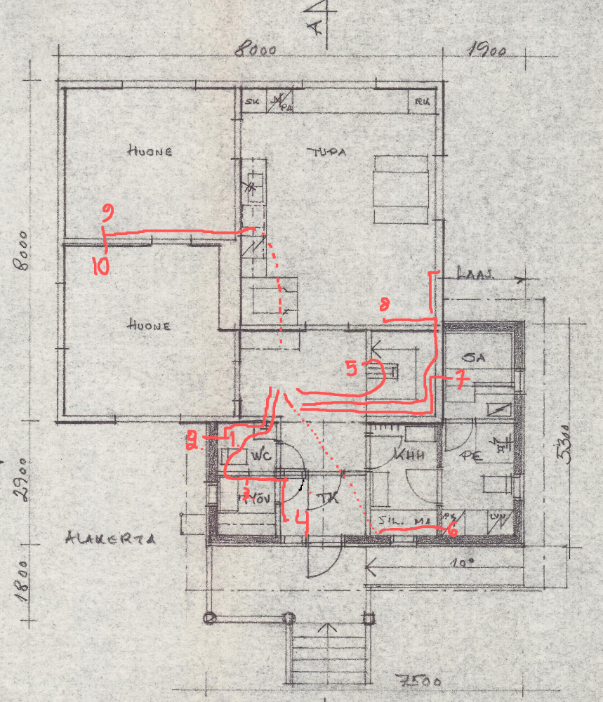 Seuraavaksi pitäisi kaapeloida. Tottakai pikkusen talon pohjakuvaa tutkin samalla kun antureita läiskin seiniin. Jokin kuva on miten nuo tulee. Oikeastaan vain makkareiden anturit, jotka kuvitelmissani menee keittiön vesijohtojen suojaputkissa, on kysymysmerkki. Saako sinne kaapelin?
