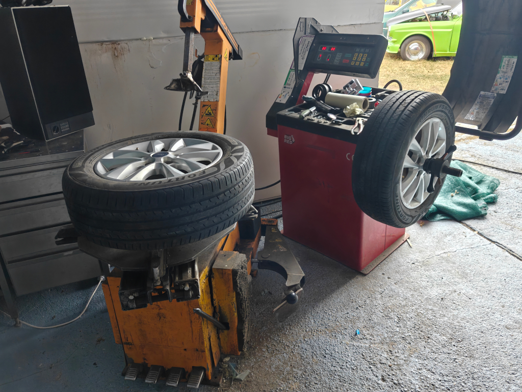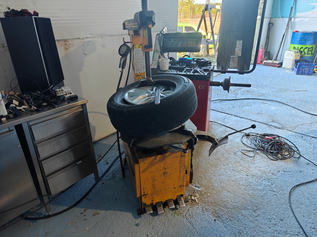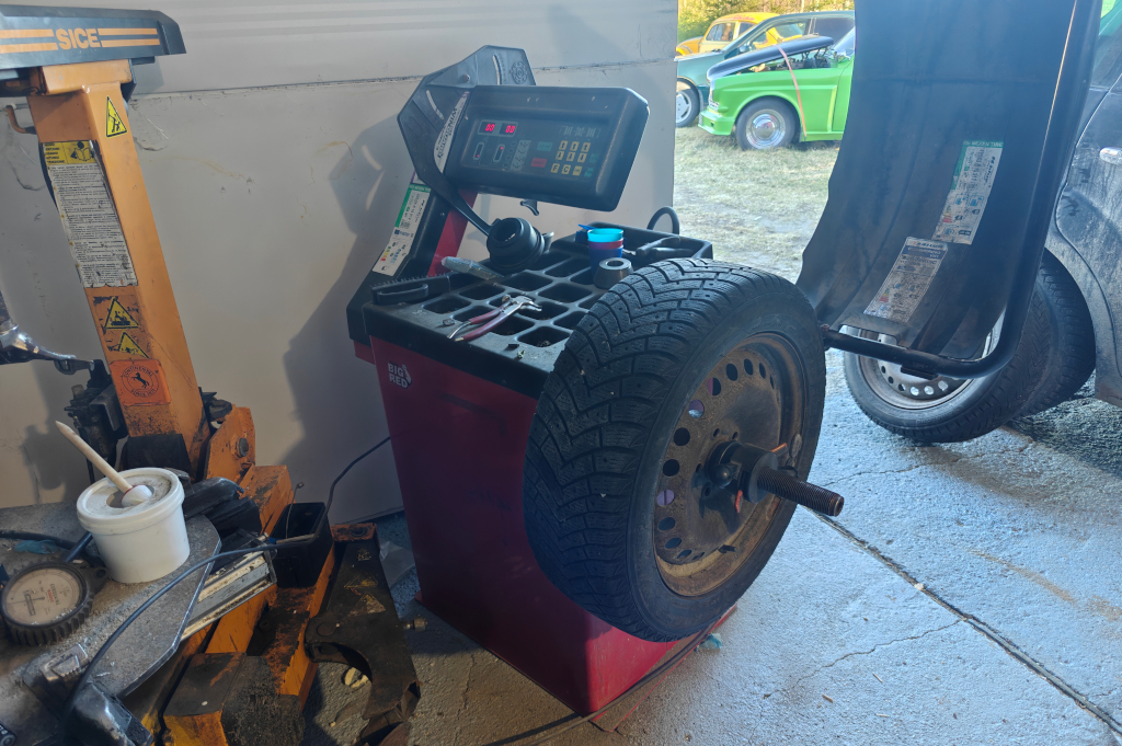 8.4. sain lopulta tasapainoituskoneen virtoihin omassa tallissa. Ei kai tuo olisi vaatinut kuin töpselin laiton, mutta ei ollut tarvetta ennen tätä. Nyt Ford asS-max alle piti laittaa "välikelin" renkaat, eli nastarenkaat joista nastat raplattu pois. Ettei saa sakkoja nastoilla ajamisesta. Jännä, oli 3kpl 205/55-16" ja yksi 205/60-16". Muista oli kaivettu nastat pois, mutta tuosta erikokoisesta oli katkottu (tai katkennut?) nastat. Melko työmaa ollu jollain... Pari renkaista oli kulunut lähes sileäksi toiselta puolelta, ja 180 asteen päässä oli ihan laillinen pinta. Siitä arvelin, että kannatanee varmaan tasapainottaa nuo. Ja olihan siellä aika hurjaa heittoa, paikalla olleet painot eivät olleet sielläpäinkään!