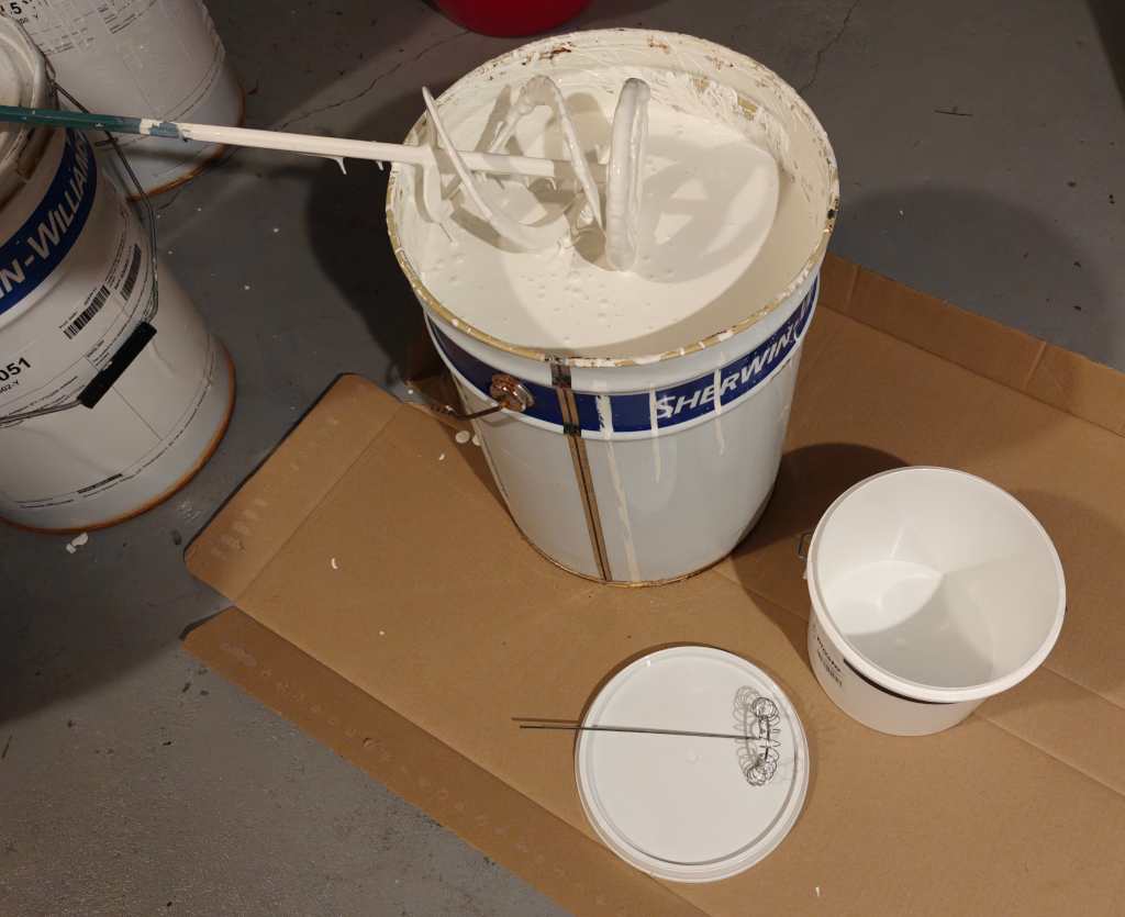 Pastat valmiina, ja sankossa 3 litraa valkoista maalia