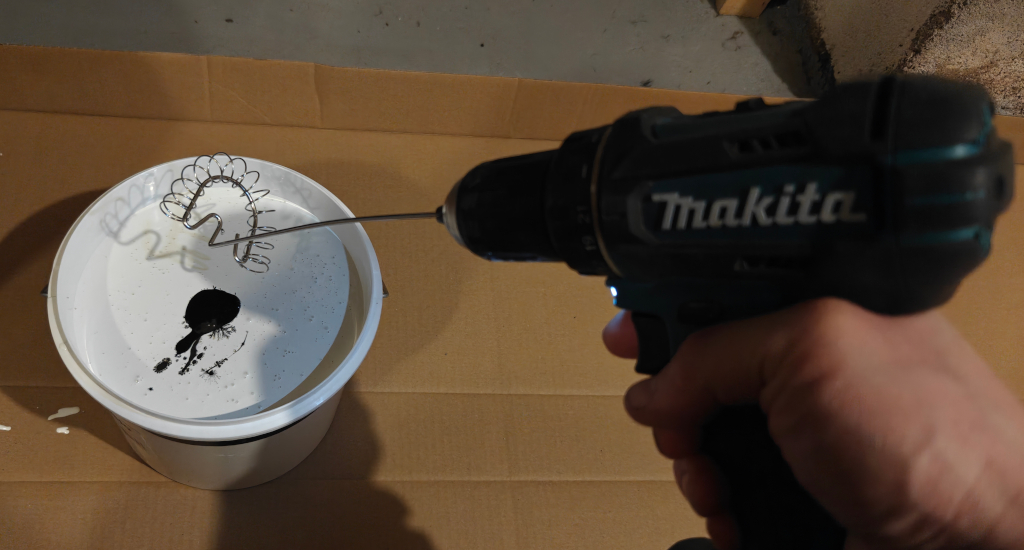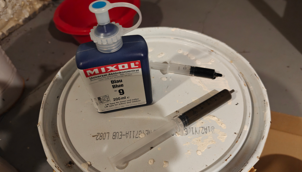 - 3 litraan valkoista maalia: Musta Mixol 3 ml(0,1%) + Oksidi-kivenharmaa 12 ml(0,4%) + Sininen 0,3 ml(0,01%) (valinnainen)