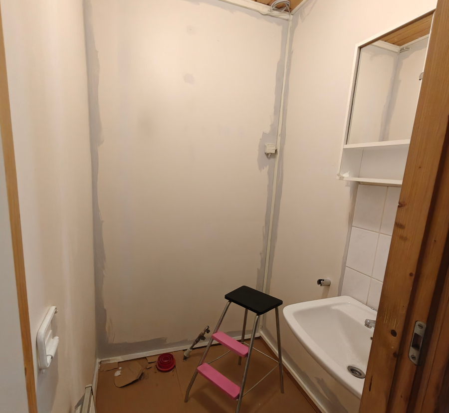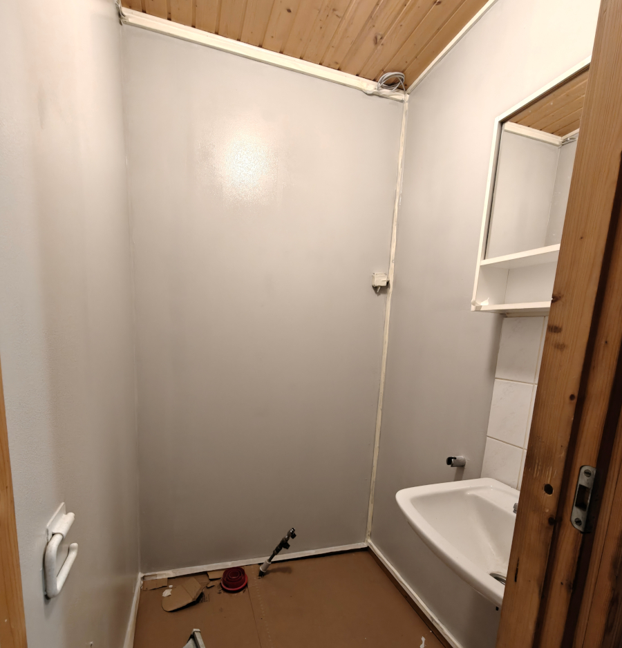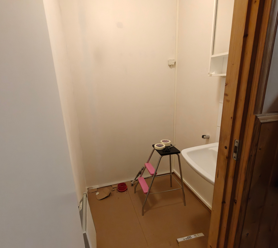 Ensimmäinen kerros maalattu. Huomenna tutkin tarviiko edes toista kerrosta. Sitten vain välineitten huoltoa eli pesua. Nostin wc-pöntön pihalle kun oli tiellä, ja nyt kun välineitä pesin niin huomasin että ilma on pakkasen puolella. Äkkiä pönttö niin tyhjäksi kuin sen saa, ettei vain jäädy rikki